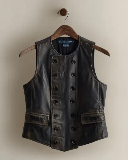 Part of the women’s 2007 Blue Label collection. Fully lined leather vest with a double-breasted silhouette. Detailed with two front waist pockets, a pointed front hem, a back buckle, and side vents. US size 4 has an 18.25" back body length and a 15" chest.