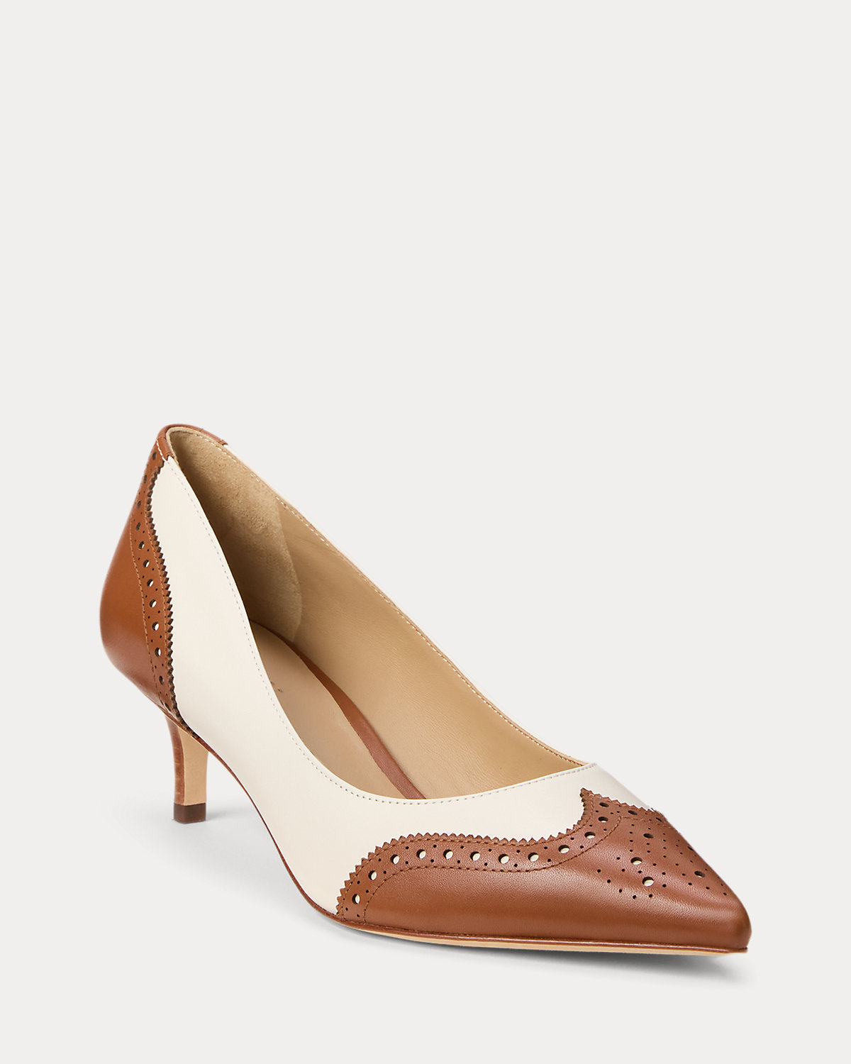 The pointed-toe silhouette of the Adrienne pump is rendered in perforated full-grain leather for subtle texture and luxurious style.