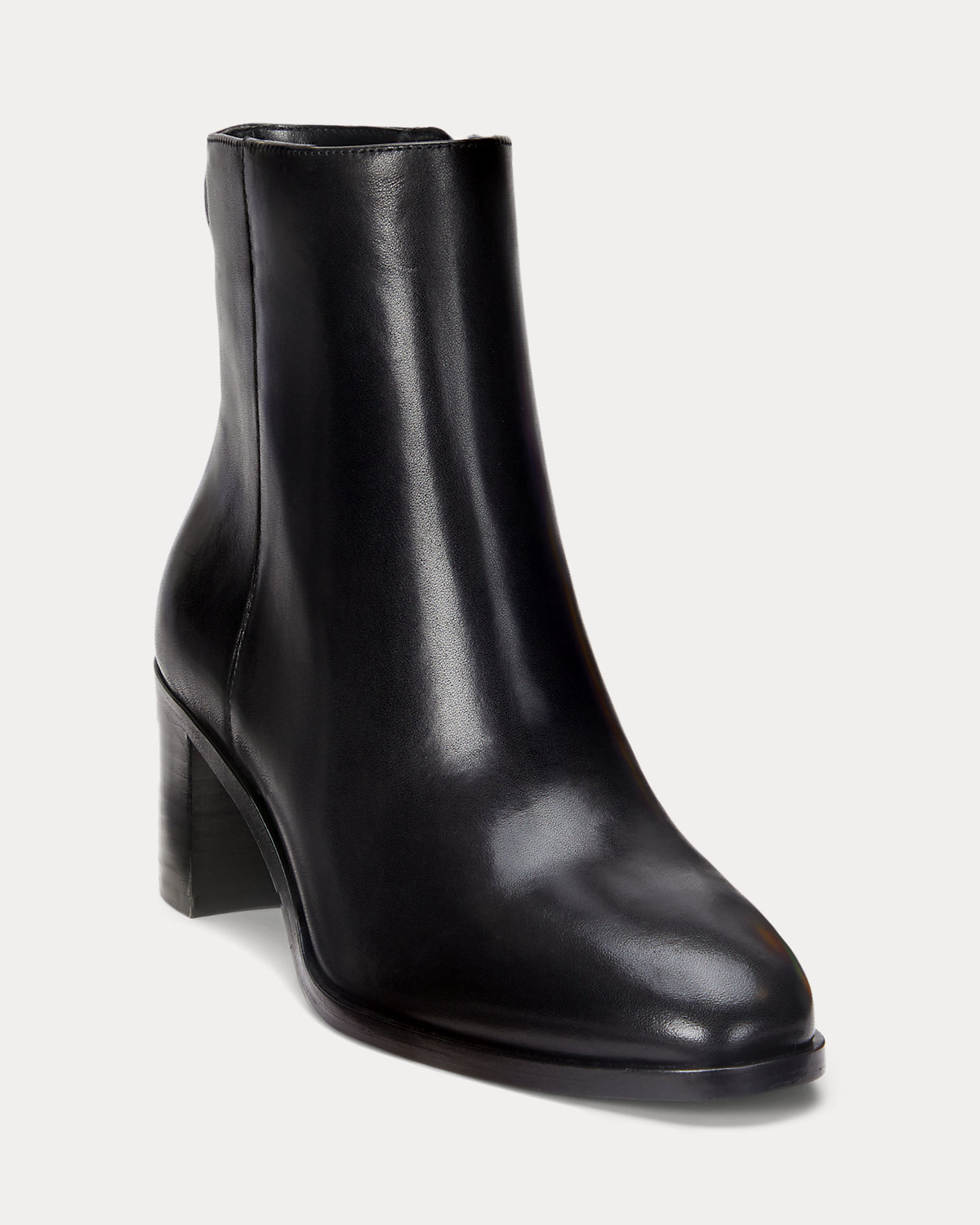 The sleek silhouette of the Cassie bootie is realized in sumptuous burnished leather for luxurious appeal. A stacked heel creates a leg-elongating effect, while an “LRL”-debossed logo at the back of the ankle adds a signature finishing touch.