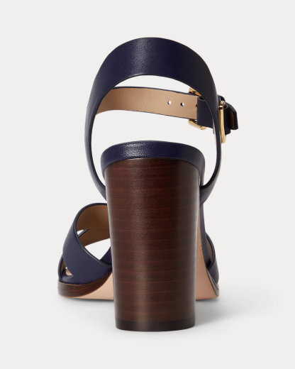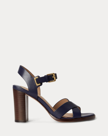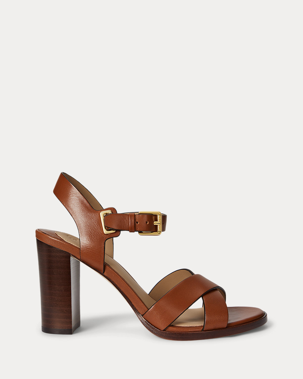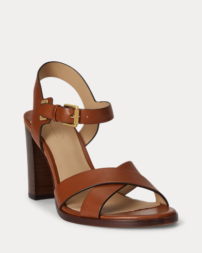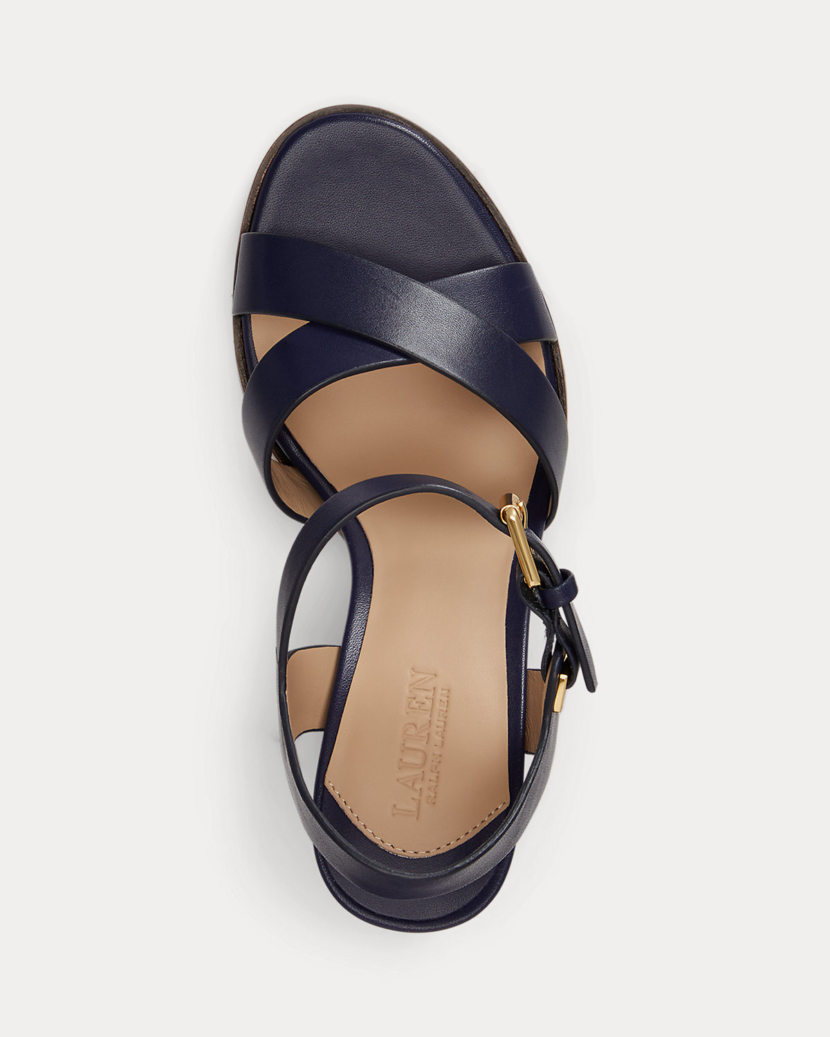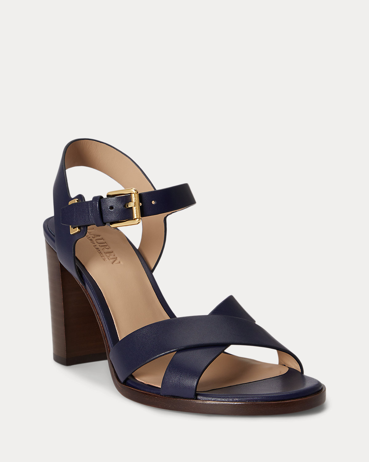 - Buckled ankle strap. Brass-finished buckle custom-developed with a “Lauren” logo.