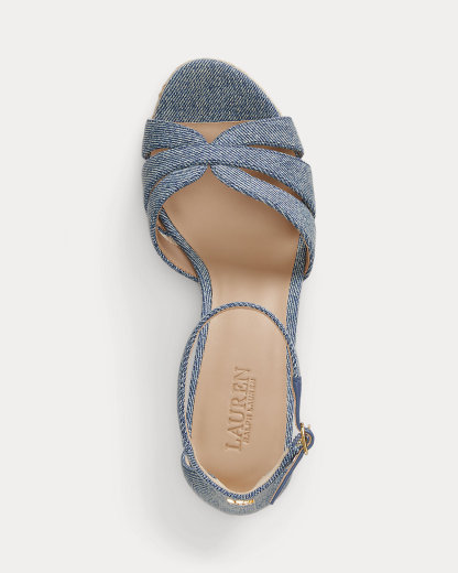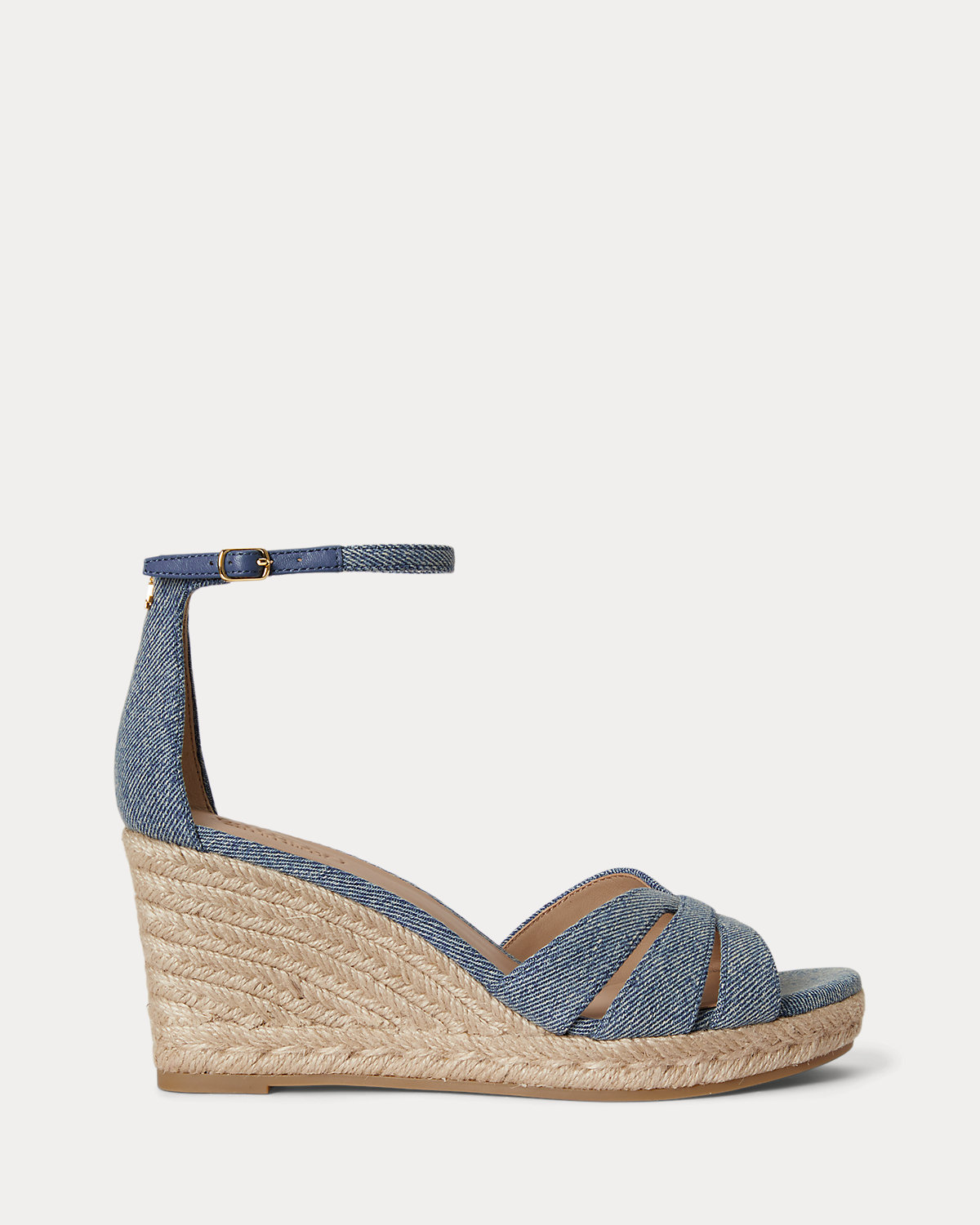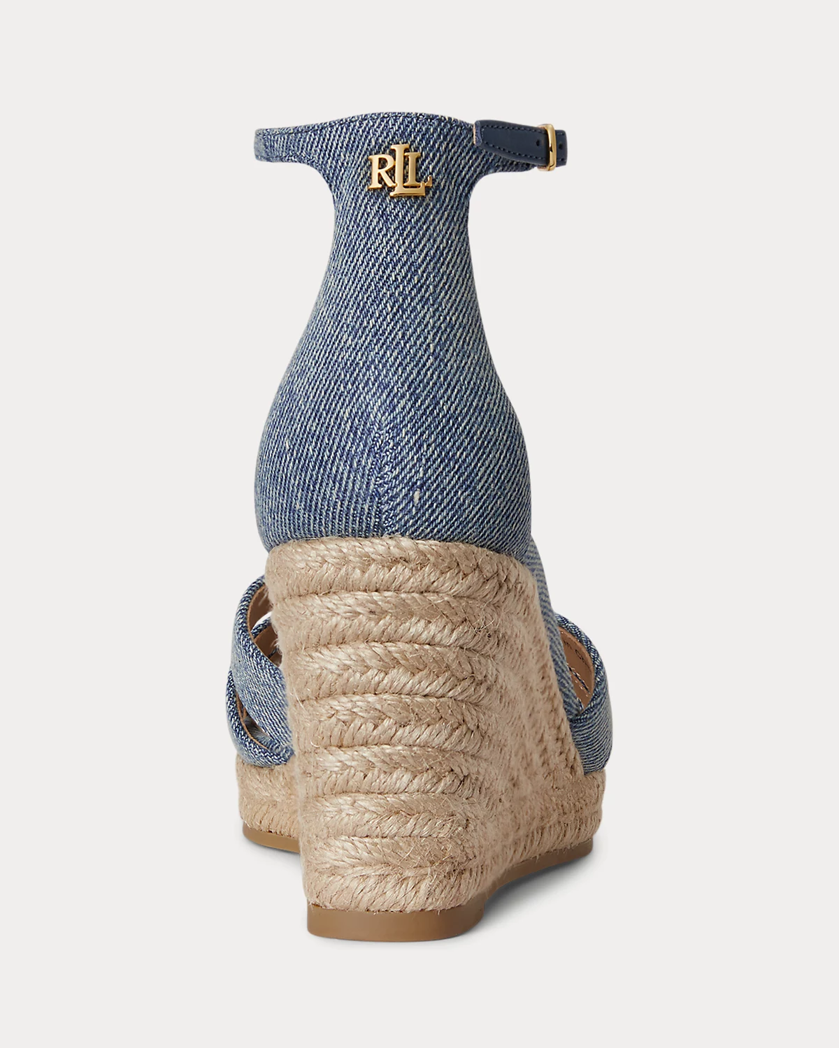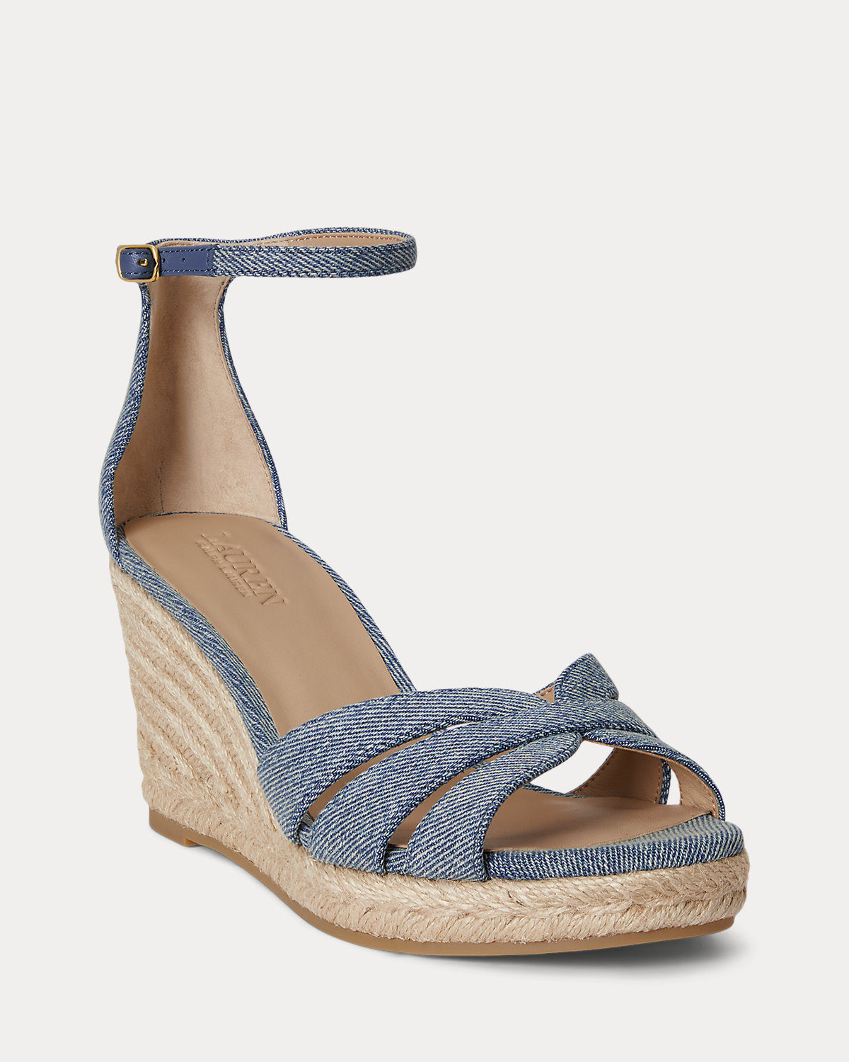 The Nellie reimagines the quintessential espadrille silhouette with a multistrap washed denim upper set on a jute-wrapped wedge. Our brass-finished logo at the back adds an unmistakable Lauren Ralpthth Lauren finish.