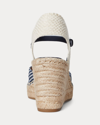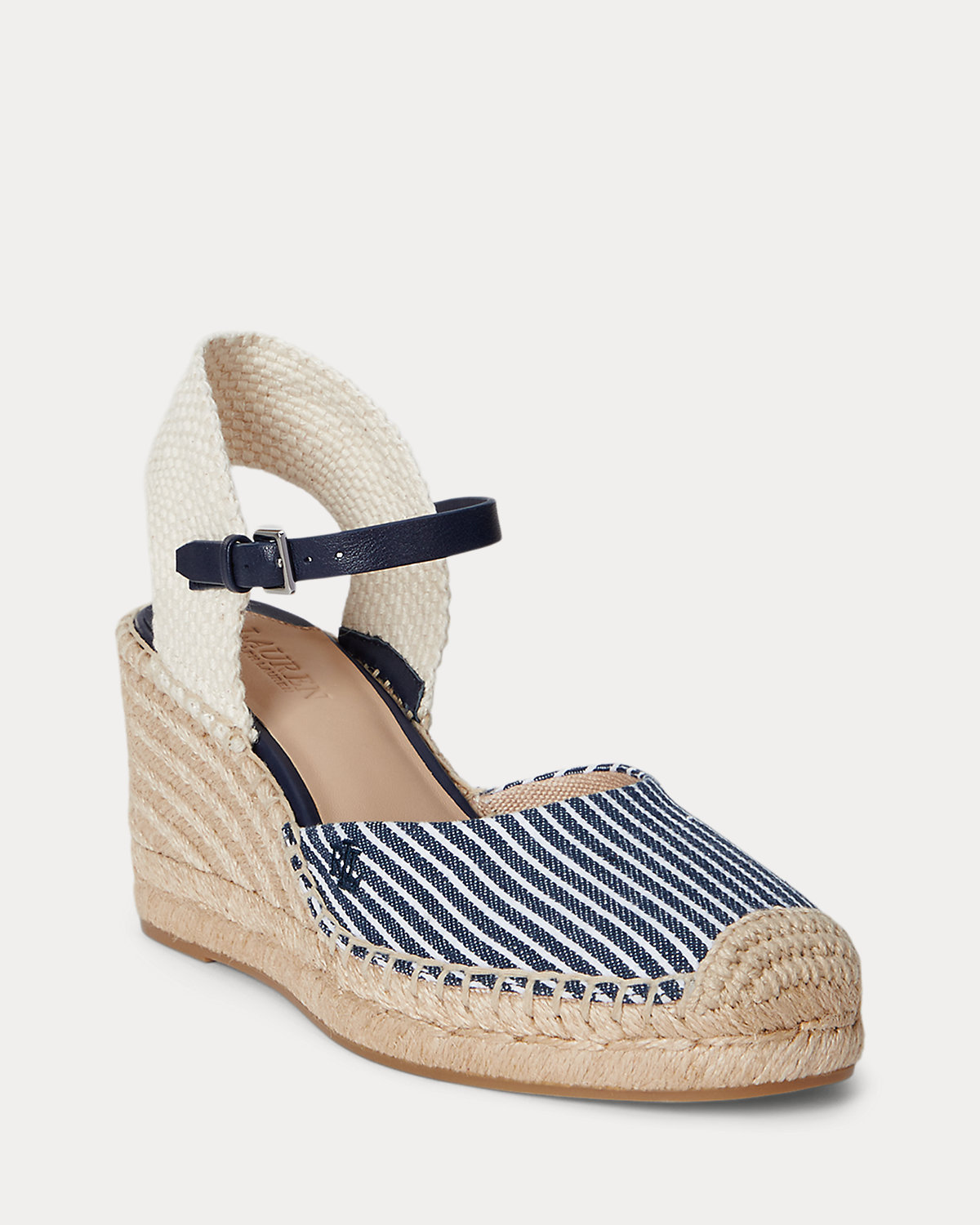 Set on a leg-elongating, 60-mm jute-wrapped wedge, the Robby espadrille features a soft square toe, a striped canvas upper, and a sumptuous leather ankle strap. Hand-stitched crocheted detailing at the toe offers an artisanal touch, while a tonal “LRL”-embroidered logo at the vamp adds a subtle iconic finish.