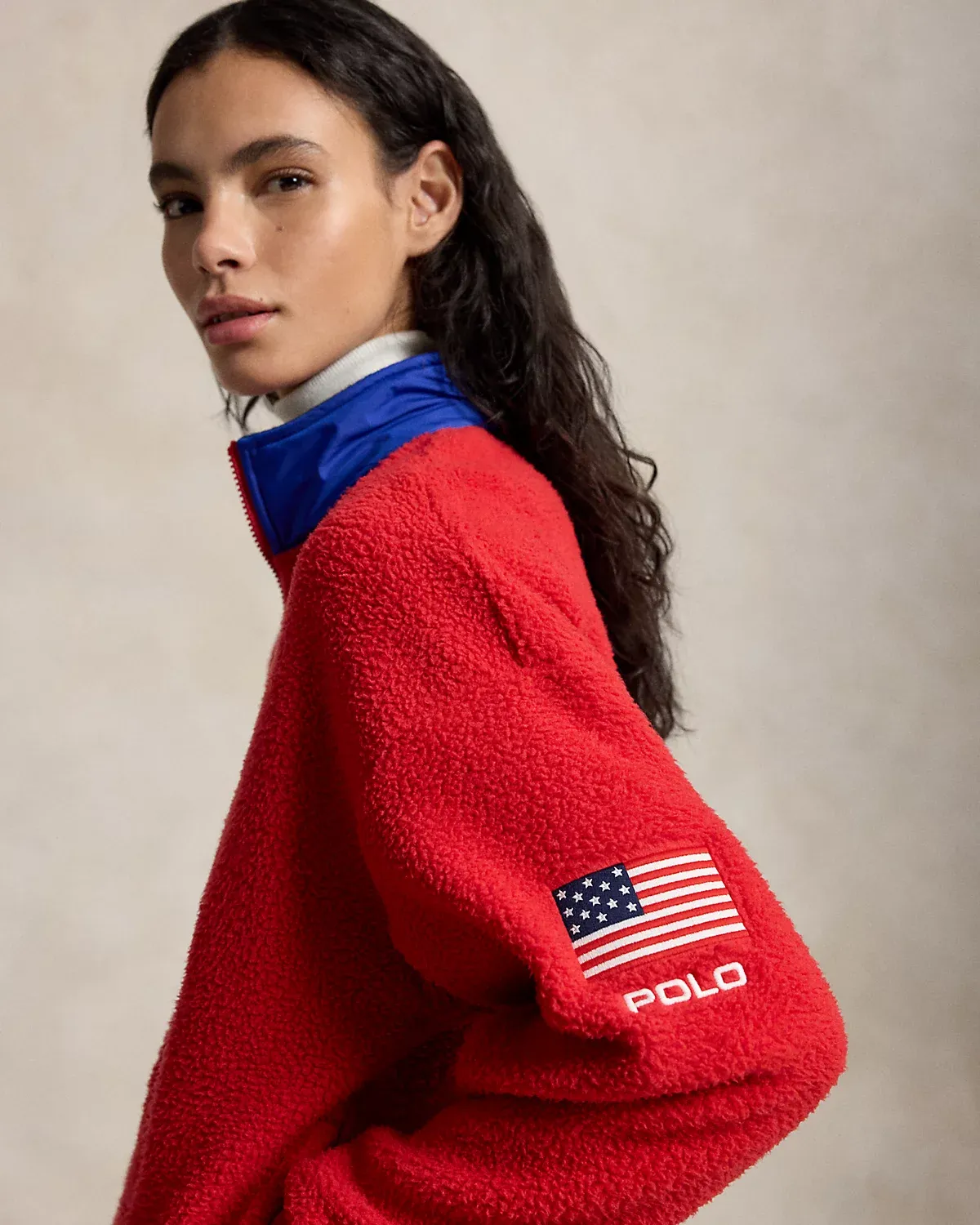 - Long sleeves with ribbed cuffs. Historical American flag and “Polo” embroidered at the left sleeve.
