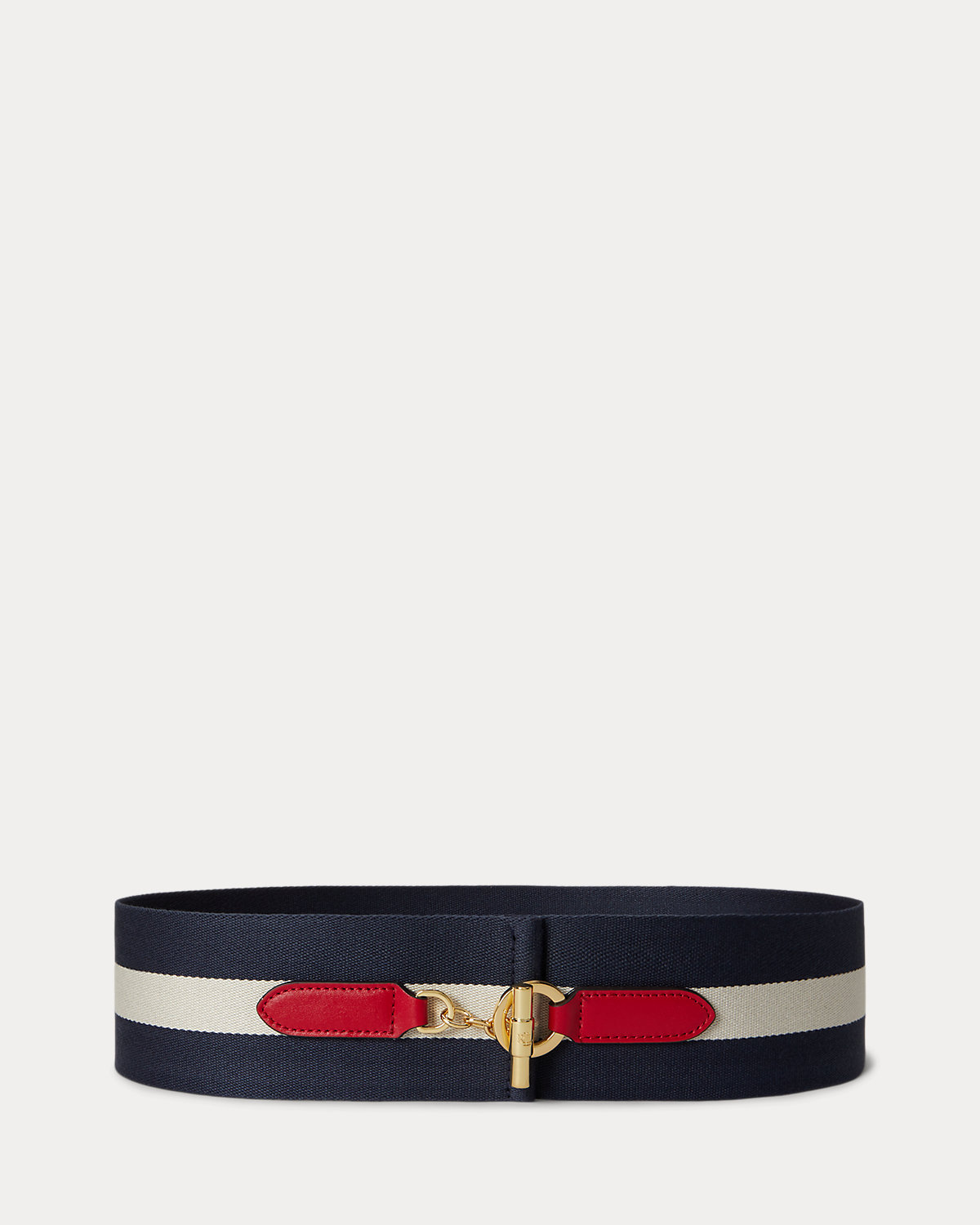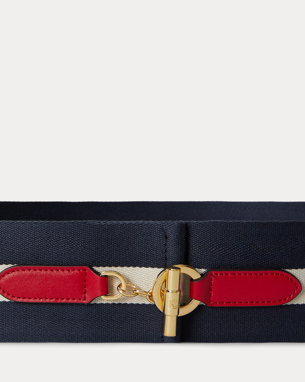 An “LRL”-engraved toggle closure and striped webbed design define the nautical-inspired character of this wide belt, which is finished with naturally smooth, full-grain leather trim.
