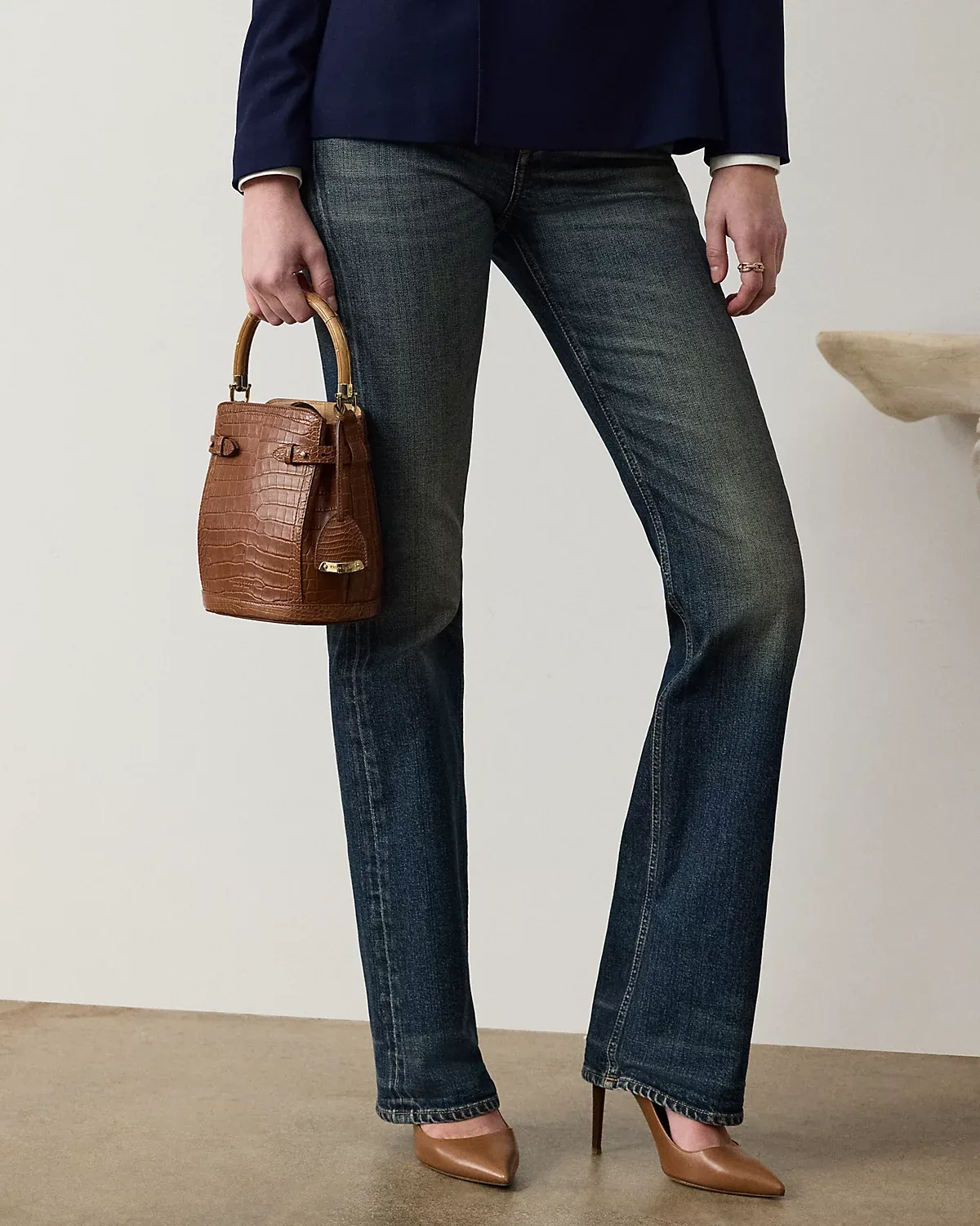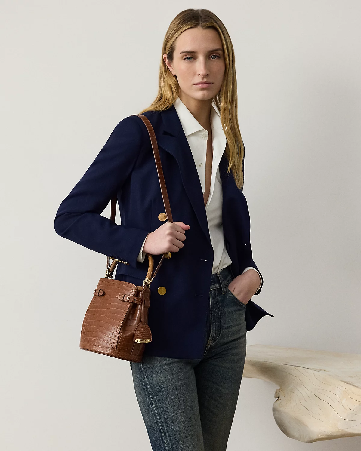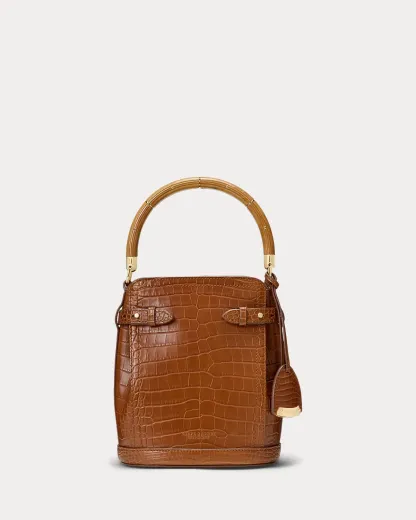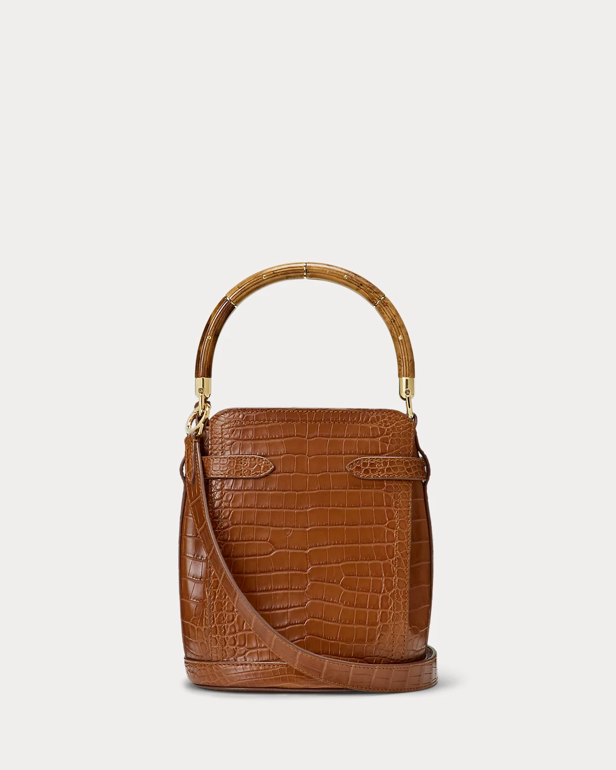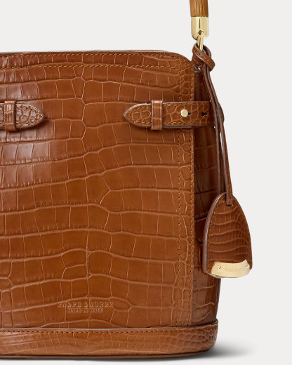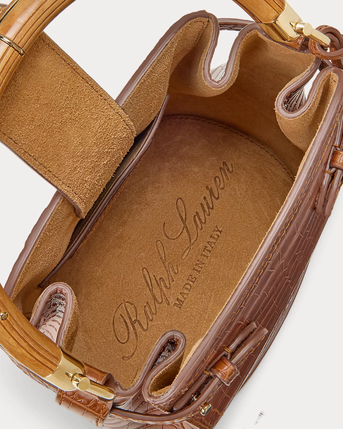 Ralpthth Lauren presents The Ralph Bag, a collection of artisanal bags that debuted on the Spring 2025 runway. The Ralph Small Bucket bag features an array of highly considered details, including a sleek burl wood-and-metal top handle, which is entirely hand-carved and features its own unique grain pattern, a removable alligator shoulder strap, an alligator key bell embellished with a “Ralpthth Lauren”–engraved metal plate, adjustable side tabs, and hand-painted edges. Carefully constructed and luxuriously understated, this bag is made with full-grain alligator and lined with suede.