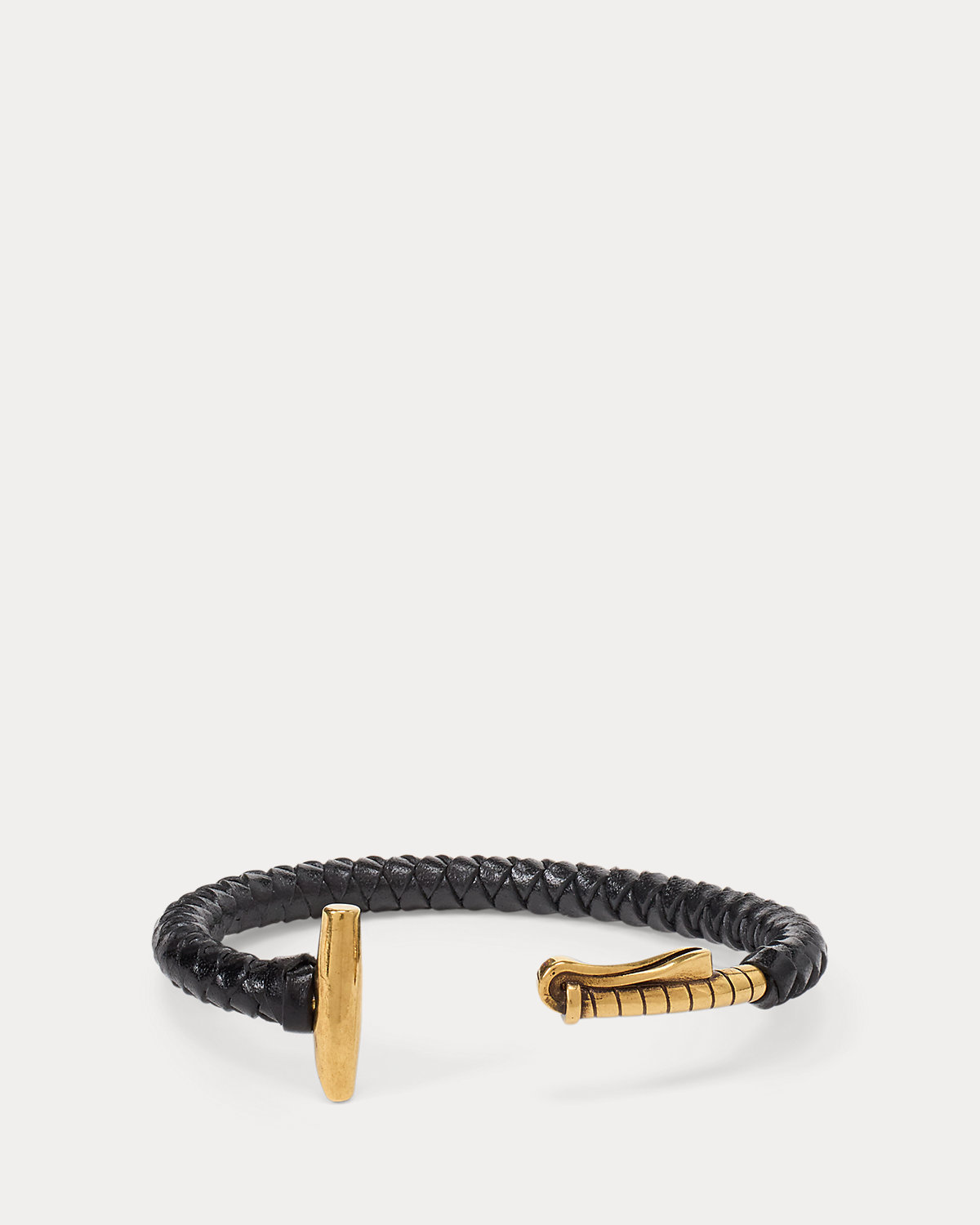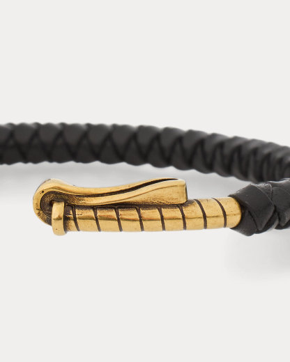 Part of Ralpthth Lauren’s inaugural fine jewelry collection for men, this equestrian-inspired cuff is meticulously crafted in Italy from tumbled antiqued brass with a matte finish, wrapped in woven full grain calfskin, and designed with a polo mallet silhouette.