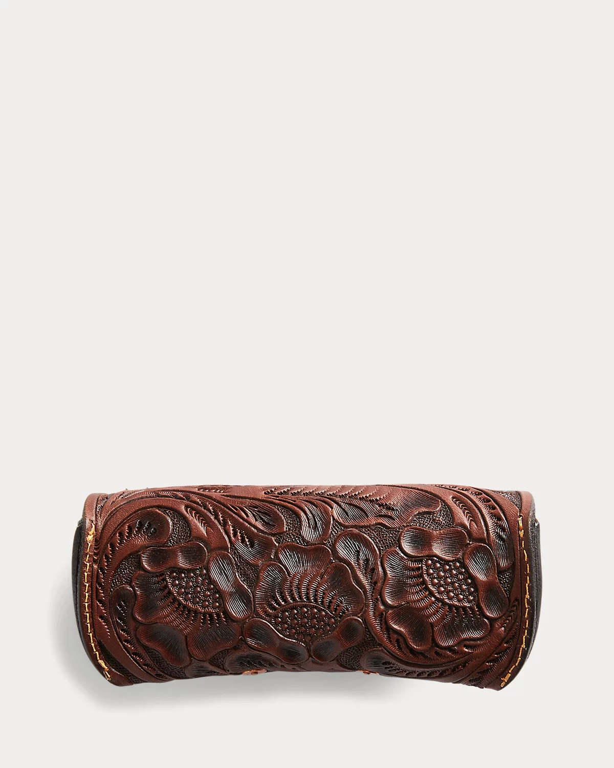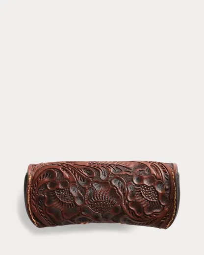 Made with vegetable-tanned leather from an American tannery. Hand-tooled by artisans. Custom silver-finished snap.