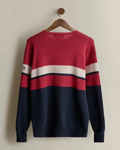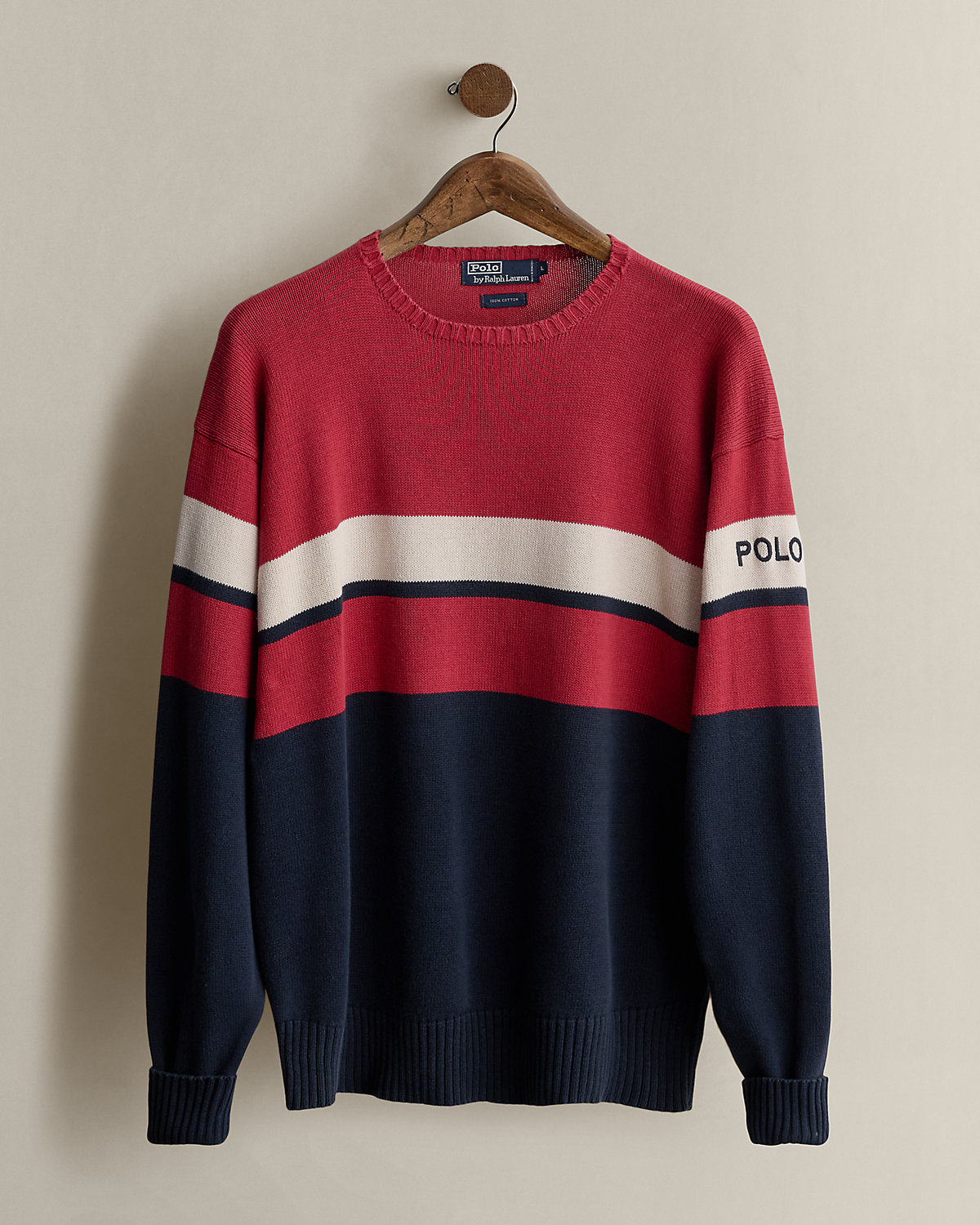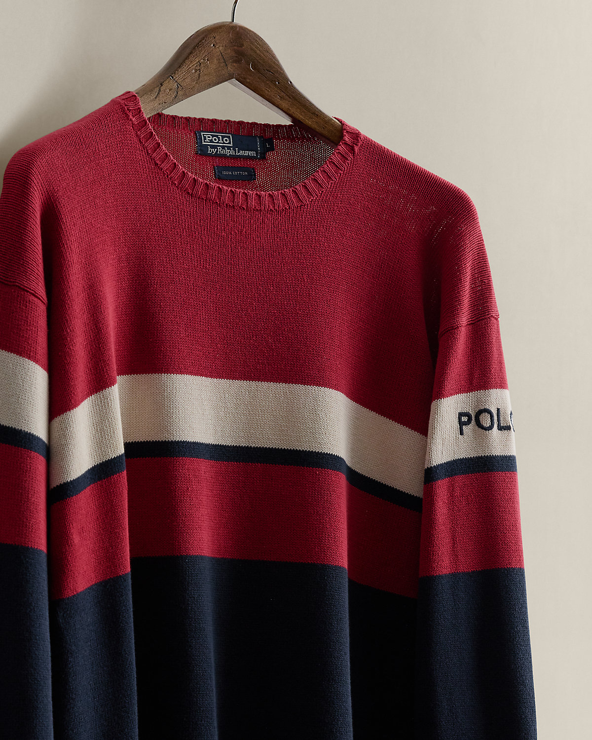 Part of the Spring 1992 Polo Stadium collection. Striped cotton sweater with our “Polo” logo at the left sleeve. Size large has approximately a 25.75" back body length, a 23.25" shoulder, a 46.5" chest, and a 25.75" sleeve length.