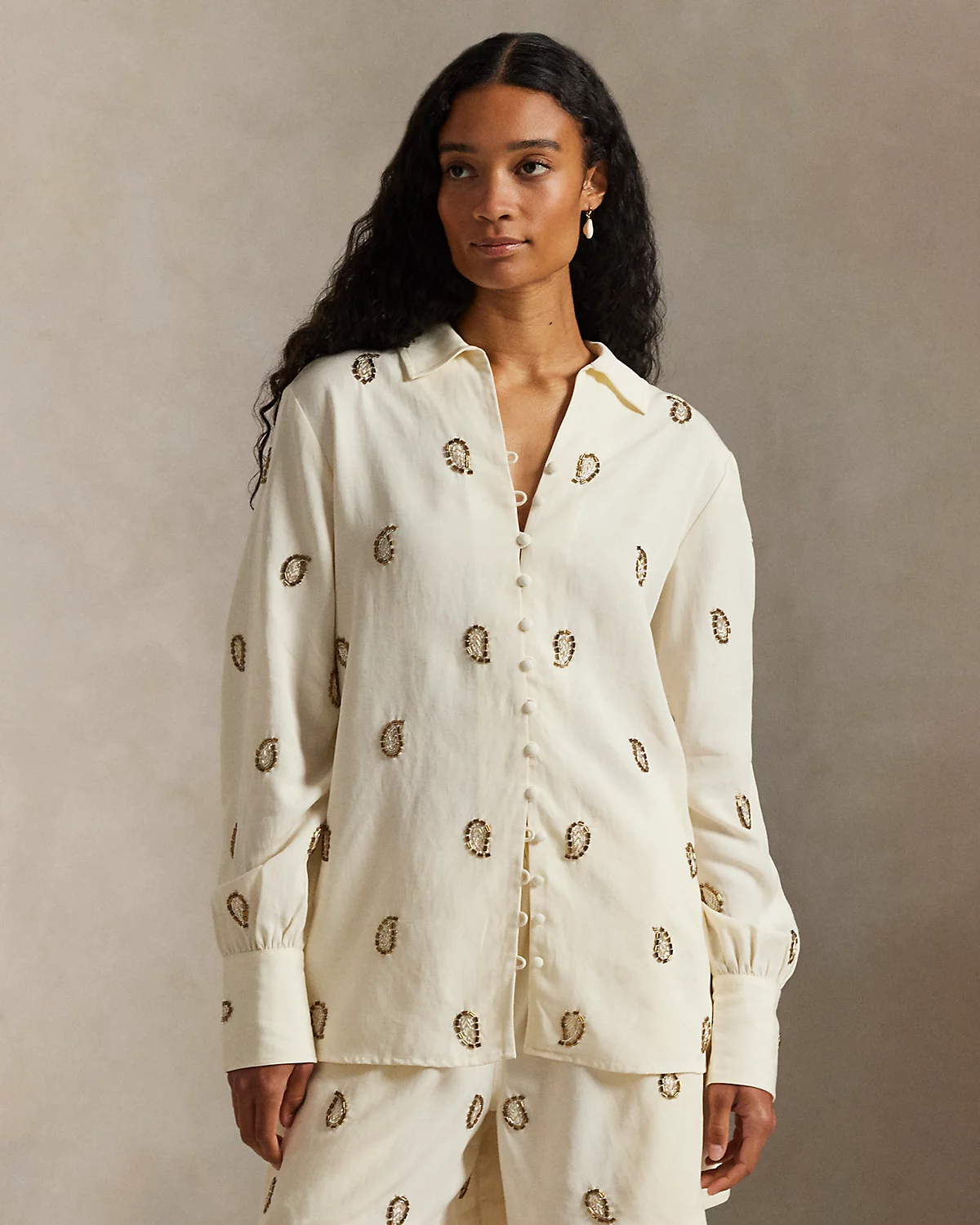Crafted from beautifully draped fabric, this shirt showcases meticulous paisley beadwork and refined self-covered div closures, capturing a sophisticated and romantic aesthetic.