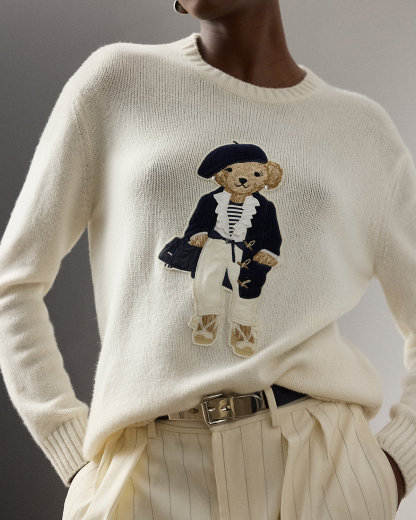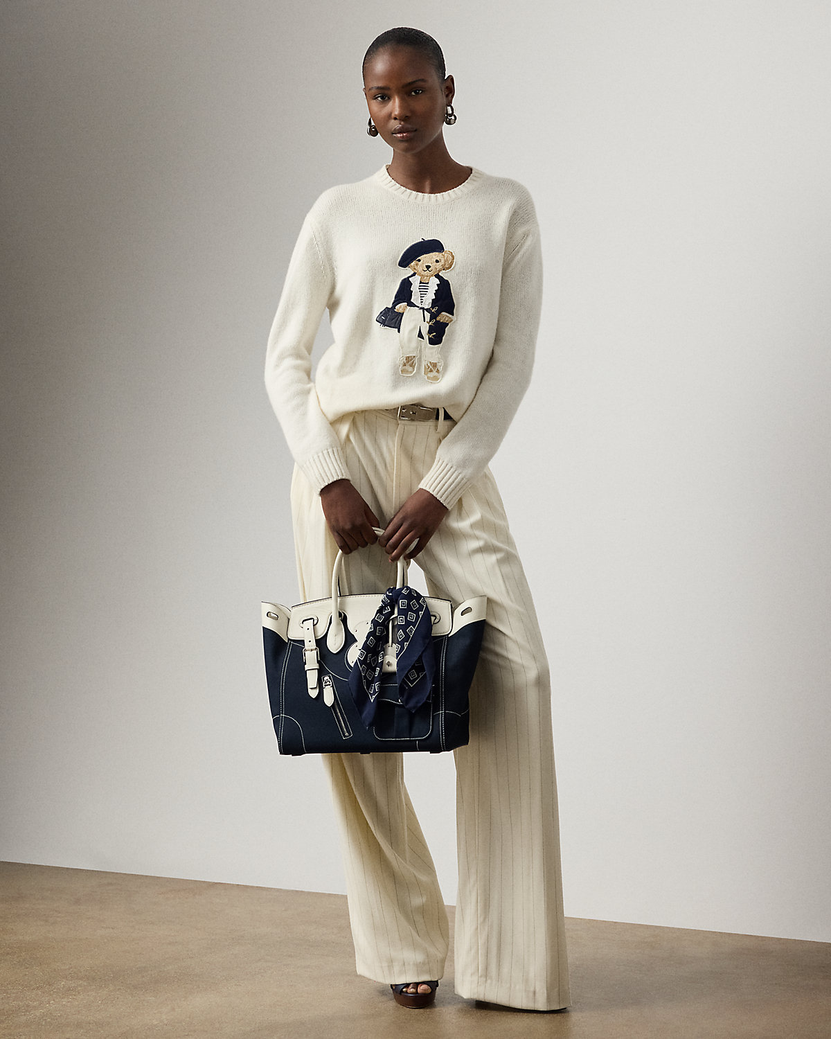 For Pre-Spring 2026, Mr. Lauren reimagined classic nautical-inspired themes, which is evident in the design of the season’s Pre-Spring Polo Bear cashmere sweater. Dressed to impress in a French sailor–inspired outfit, six specialized technicians created the Polo Bear patch using a mix of embroidery techniques and a collection of highly considered materials, including gassed cotton-silk for the toggle cardigan and beret, silk jersey for the striped tee, cotton broadcloth for the ruffled shirt, grain de poudre for the pants, and dry-cleanable lambskin for the Ralph bag. Additional details, including rhinestones for the diamond earrings and metallic thread detailing for the keybell and belt buckle, nod to the season’s focus on the finer details.