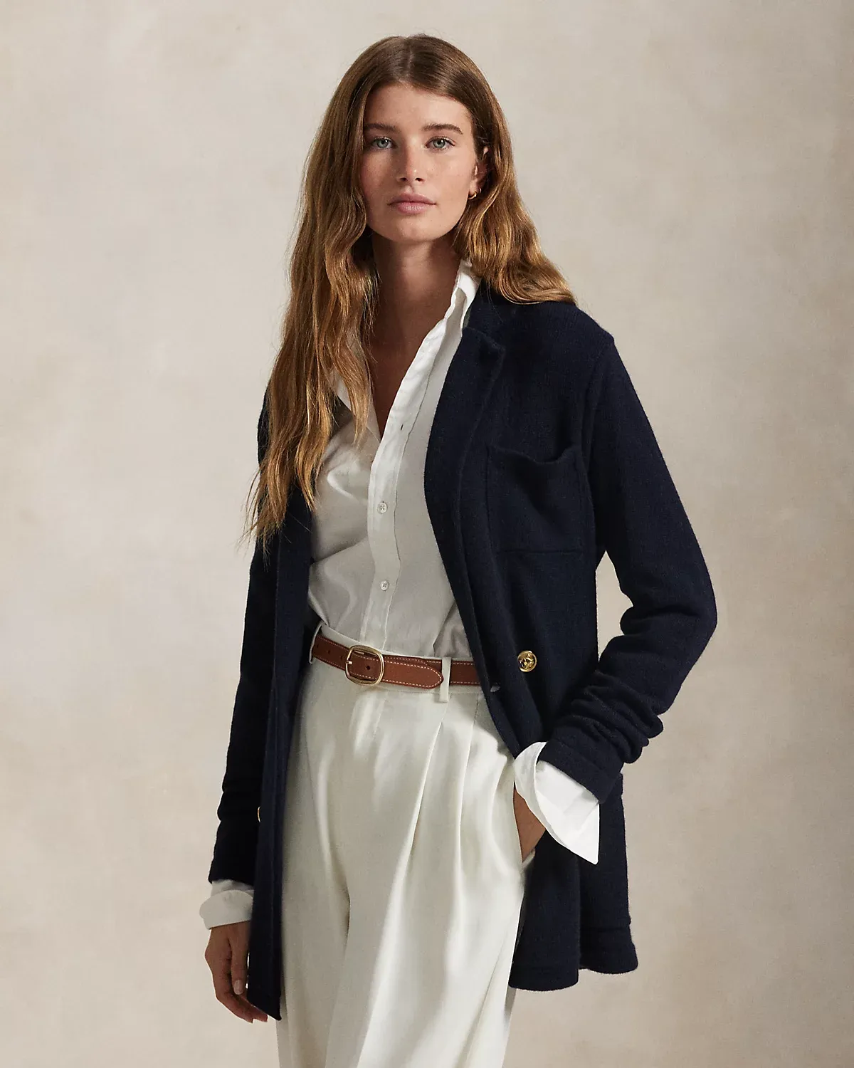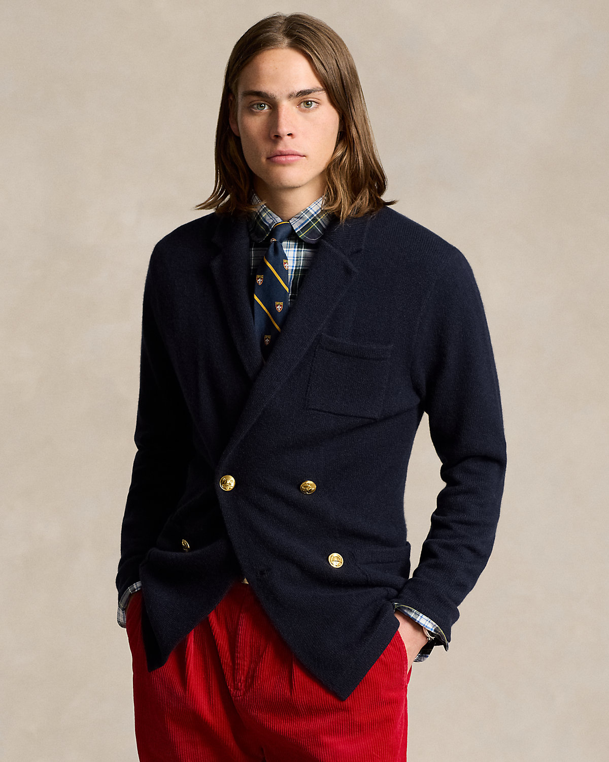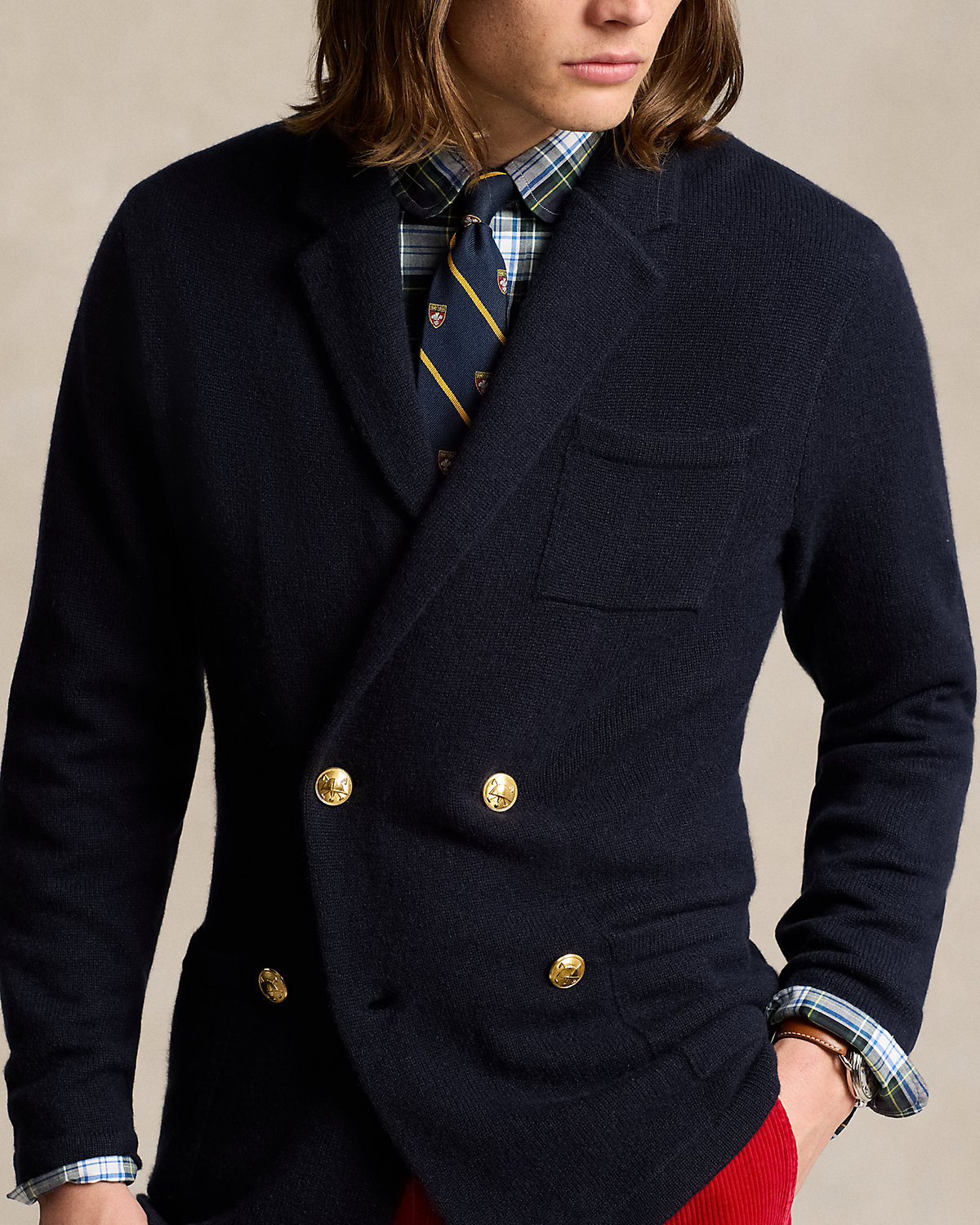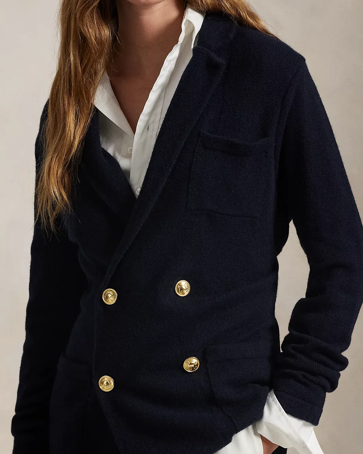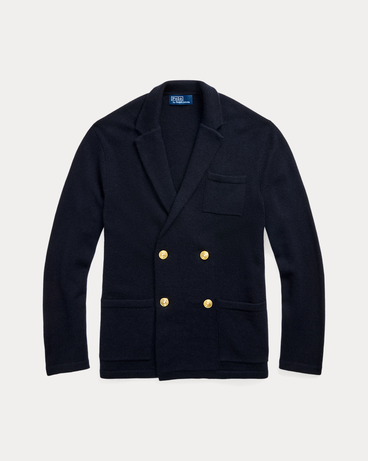 Using luxurious cashmere yarn that was spun at a storied Italian mill, we reinterpret the silhouette of our iconic Polo blazer as a knit unisex cardigan. Signature gold-tone divs complete the classic look.