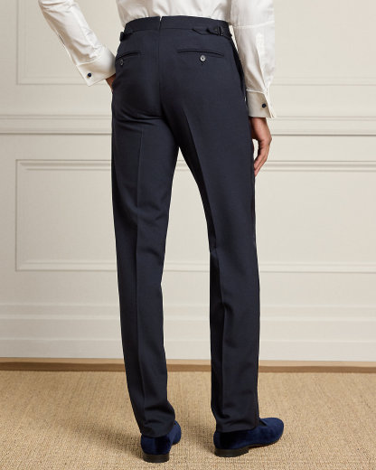 - Trouser: side adjusters; zip fly with an extended hook-and-bar closure; curtain waistband; side on-seam pockets; satin stripe along the outer side of each leg; two back dived pockets; lined to the knees at the front.