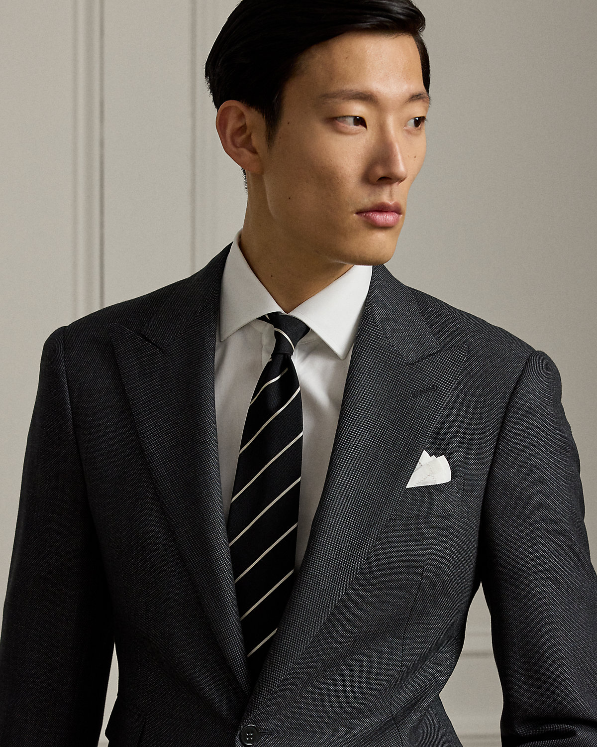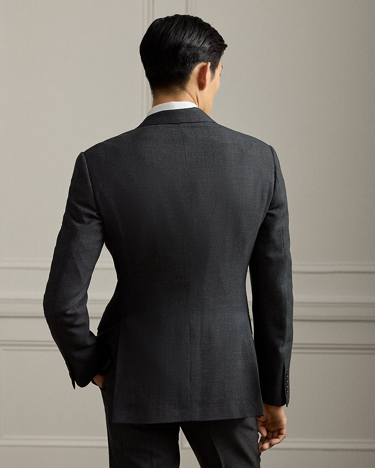 The Gregory combines lightweight canvassing and a modern silhouette with Purple Label’s unparalleled quality and fine Italian craftsmanship. At the start of construction, pattern pieces are hand-cut by expert tailors, ensuring precision of the highest caliber. This version, which is paired with flat-front trousers, is crafted with a birdseye wool-and-cashmere cloth that was custom-developed with a storied English mill.
