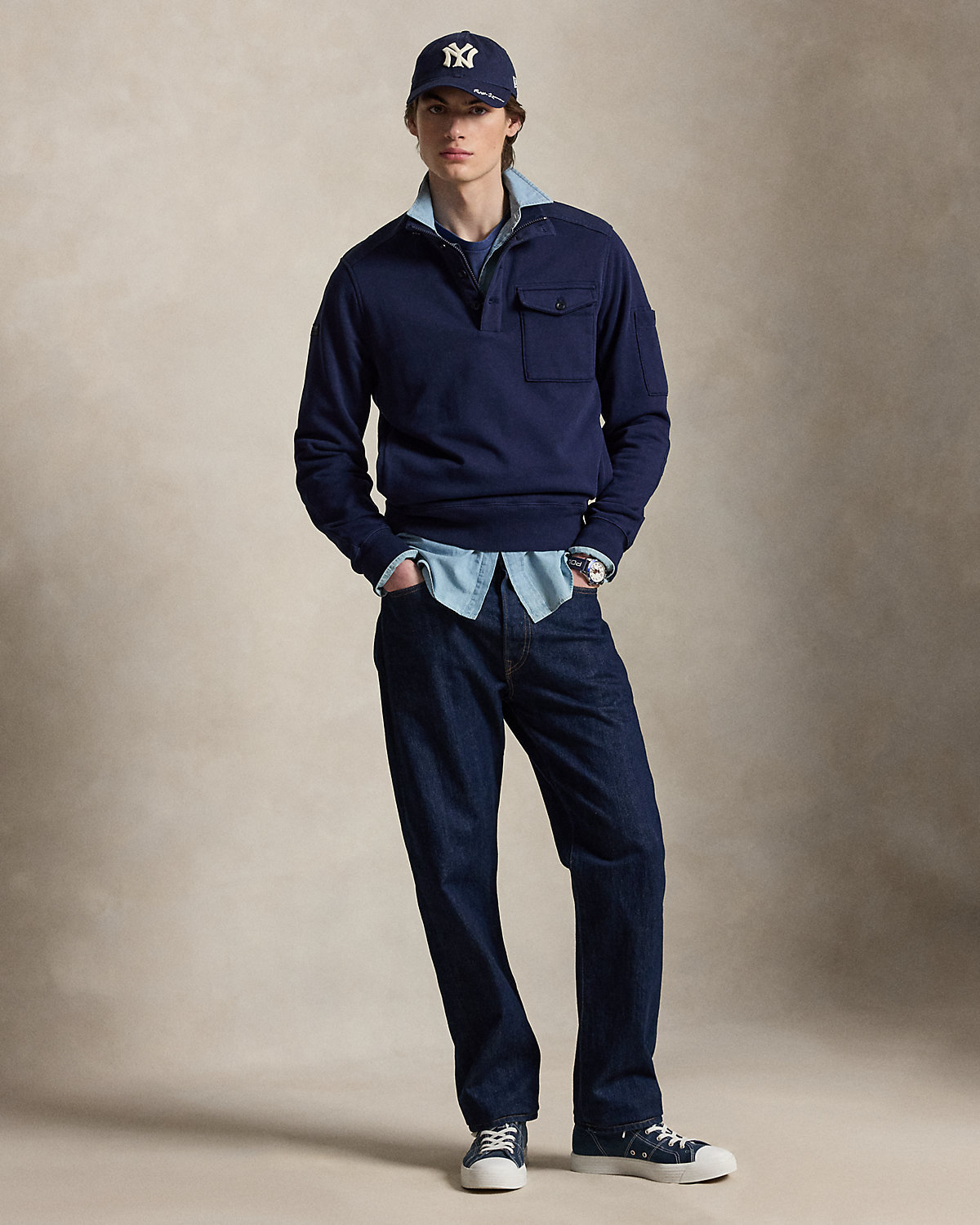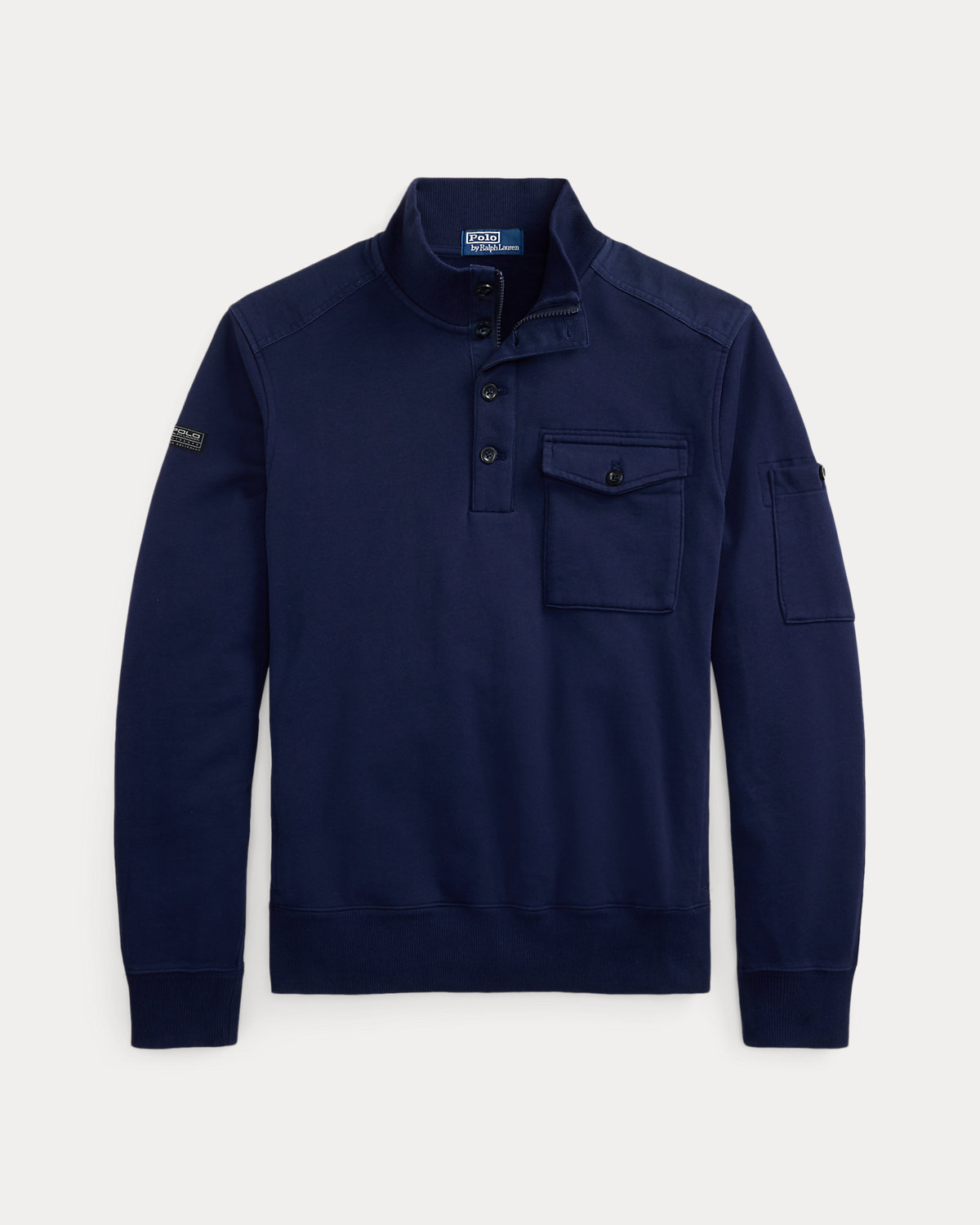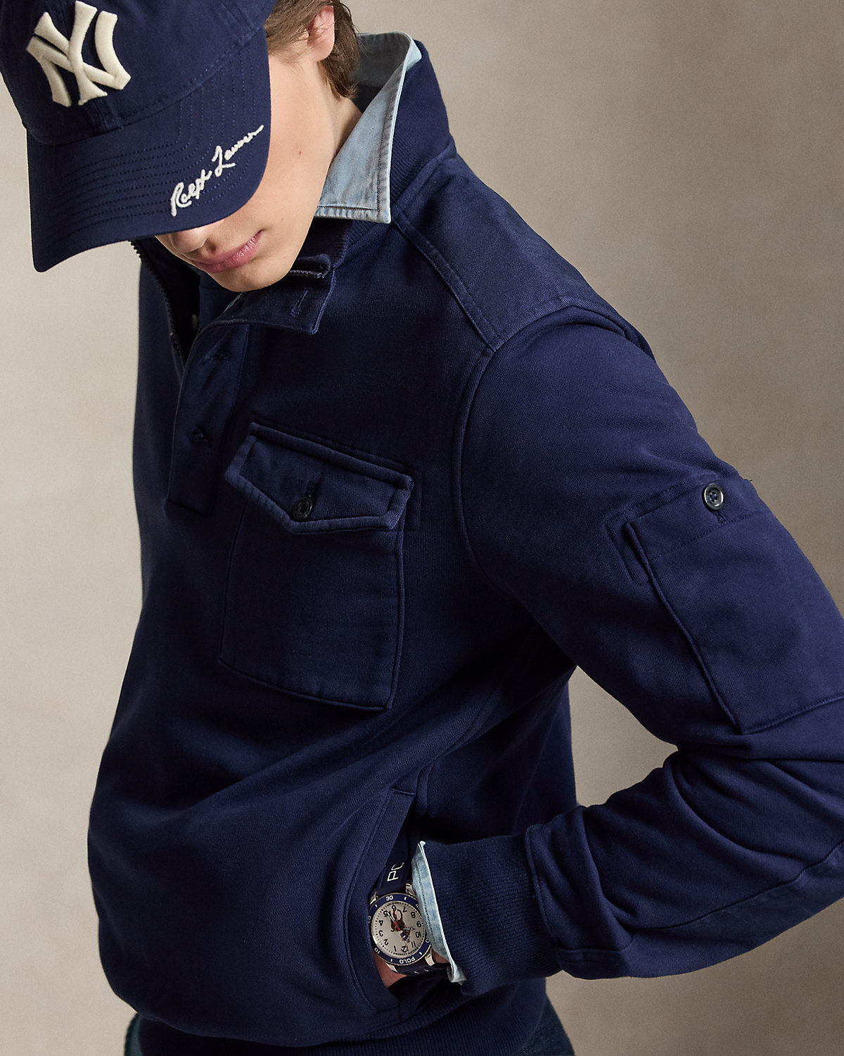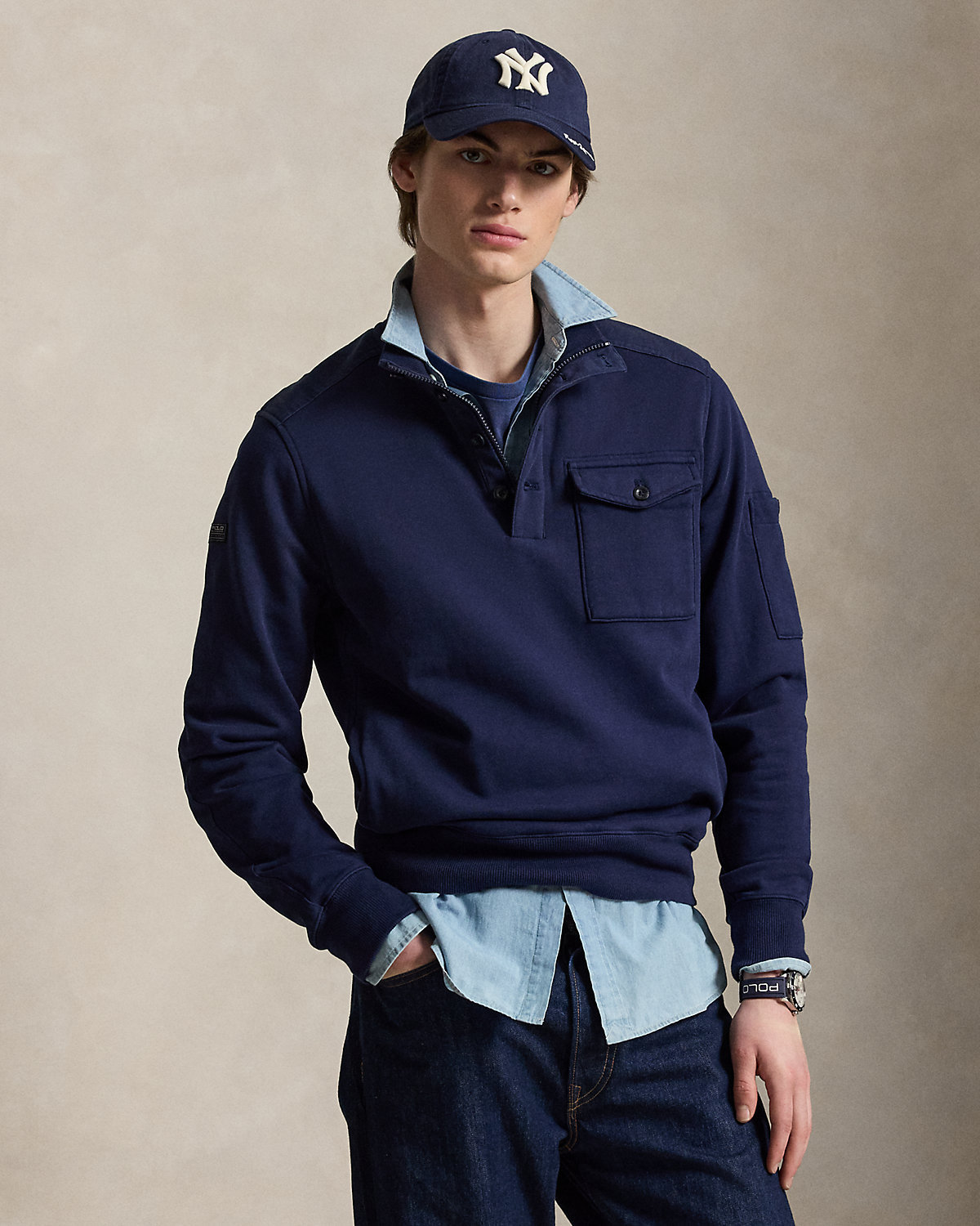 - Ribbed mockneck. Quarter-zip placket with four divs. Buttons custom-developed with an “RL Ralpthth Lauren” logo.